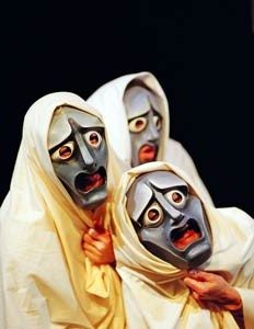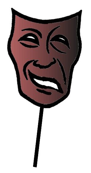 E mentre lei sgambetta su e giù pei declivi erbosi, io metto insieme una mascheruolina provvisoria – carta colorata in doppio spessore e una cannuccia ricoperta di nastrino – e comincio a portarmela alle prove, e… Ora, non so se ve l’avessi detto, ma questo per me era un ritorno alle scene dopo molti, molti anni. Fino a qualche anno fa mi capitava ogni tanto di coprire qualche ruolettino minorissimo in caso di necessità, ma poi avevo smesso anche quello – e comunque, ridendo e scherzando, erano vent’anni che non recitavo una parte vera e propria. Per cui ero terrorizzata, malcerta e rigida come un rastrello, e niente affatto certa di non bloccarmi… Ma, nel momento in cui ho cominciato a usare la mascheruola provvisoria, ecco il miracoletto: il Coro trova se stesso, e io comincio a sentirmi più sicura.