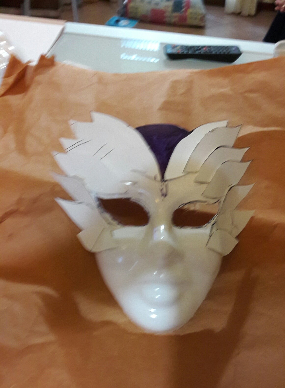 E forse G. crede che voglia farle una sorpresa – oppure metterla davanti a un fatto compiuto – ma non è affatto così. La maschera è ancora chez Alchemilla, in attesa del color rame. Quasi pronta, e nel corso del pomeriggio l’ho tenuta in mano con tanto di bacchetta, ma non era ancora pronta quando me ne sono andata per fuggire direttamente alle prove…