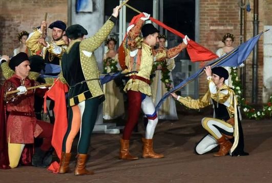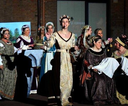volere me e gli Histriones – del che le sono grata. A parte il fatto che è stato molto divertente scrivere in endecasillabi simil-ariosteschi, e che ho conosciuto un simpatico gruppo di cortigiani ducali, tanto appassionati di storia quanto disponibili verso i nuovi venuti – ebbe, a parte tutto questo ho avuto l’occasione di sfilare nel corteo indossando uno di quei meravigliosi costumi di cui si diceva – una tra i millecinquecento figuranti, al suono dei tamburi e delle trombe, lungo le vie di Ferrara antica, mentre cadeva il crepuscolo… Che devo dire? È stato emozionante. Smaltito il timore di pestarmi la gonna – e quello di sollevarla troppo nel tentativo di non pestarla (perché il magnifico costume era stato pensato per gente più alta di me…), mi sono persa nell’impressione che certe cose non fossero cambiate poi troppo negli ultimi cinque secoli e moneta… E poi lo spettacolo – o meglio, gli spettacoli di corte e contrade, nove in tutto, con punte di rimarchevole bellezza e, per lo più, nulla di troppo diverso da quel che avrebbero potuto vedere, all’epoca, i personaggi che interpretavamo seduti sul palco ducale.